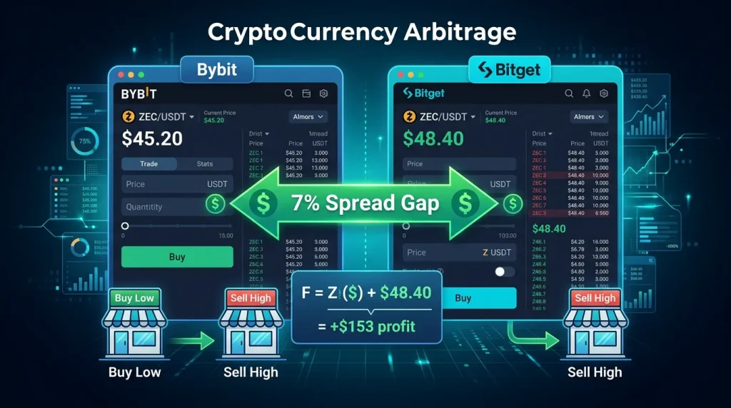 The same thing happens in crypto: the same asset trades at slightly different prices on different exchanges. ZEC/USDT on Bybit — one price, on Bitget — another. This difference is called a spread.