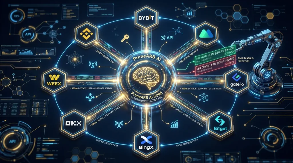 This is the main simplification that makes the platform accessible to beginners. You deposit funds once into the PrimeARB AI system. The platform automatically creates sub-accounts on all 8 supported exchanges: